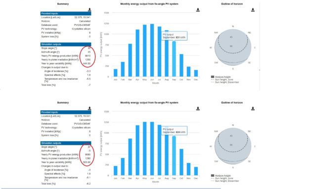 Zastanawiacie się zapewne czy posiadając dom z dachem czterospadowym z nachyleniem 30 stopni lub mniej, jest sens instalować tam panele fotowoltaiczne? Polecam stronę UE: https://re.jrc.ec.europa.eu/pvg_tools/en/tools.html Posiłkując się tym programem z linku powyżej, postaram się porównać wydajność dla naszej szerokości geograficznej w najlepszych warunkach i w przykładowych. Najlepsze warunki dla nas to kąt nachylenia 37 stopni…